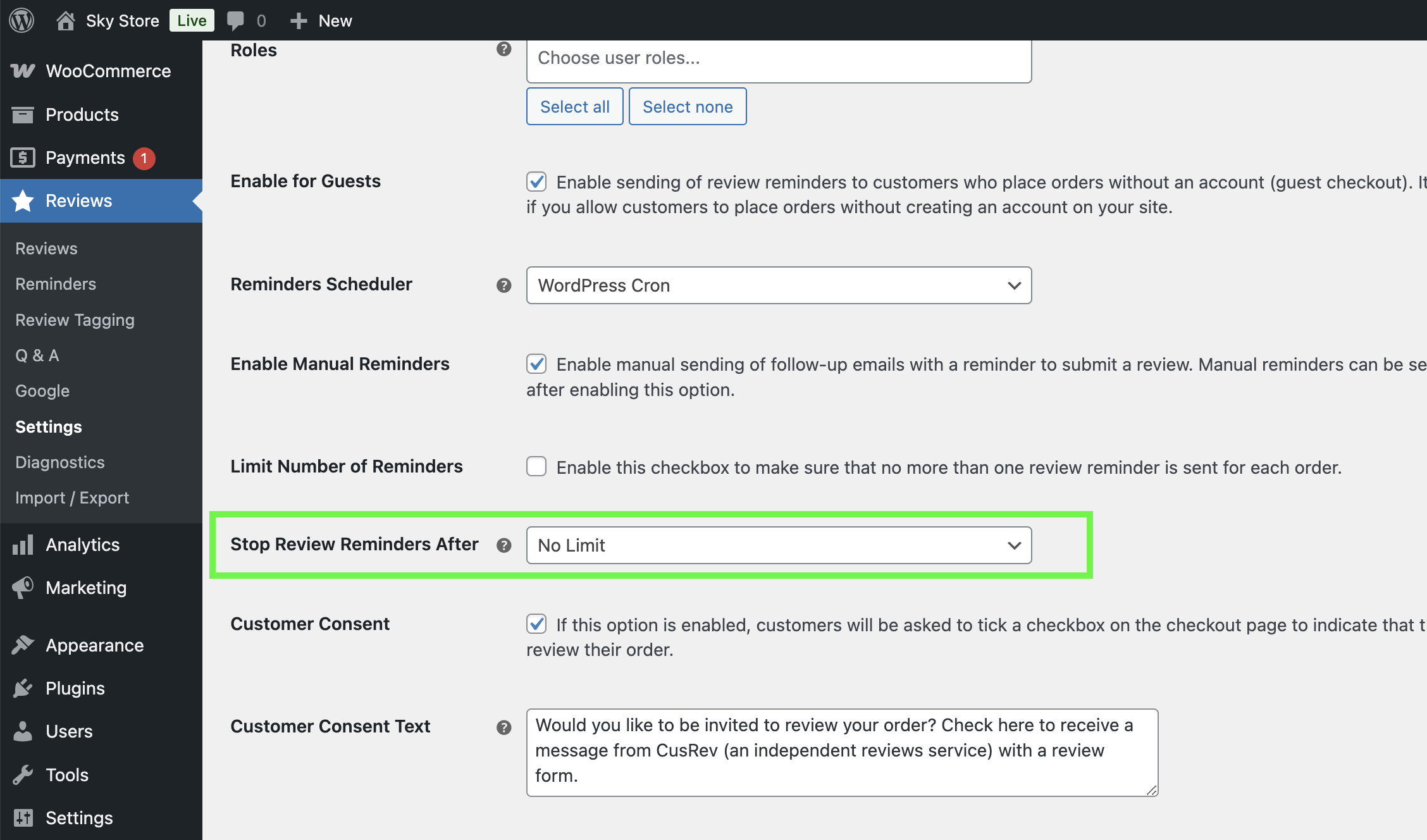 The 'Stop review reminders after' option is available in the Pro version of the plugin and can be activated either in WordPress dashboard if using WP Cron for scheduling review reminders or in the dashboard at CusRev.com if using CR Cron for scheduling review reminders.